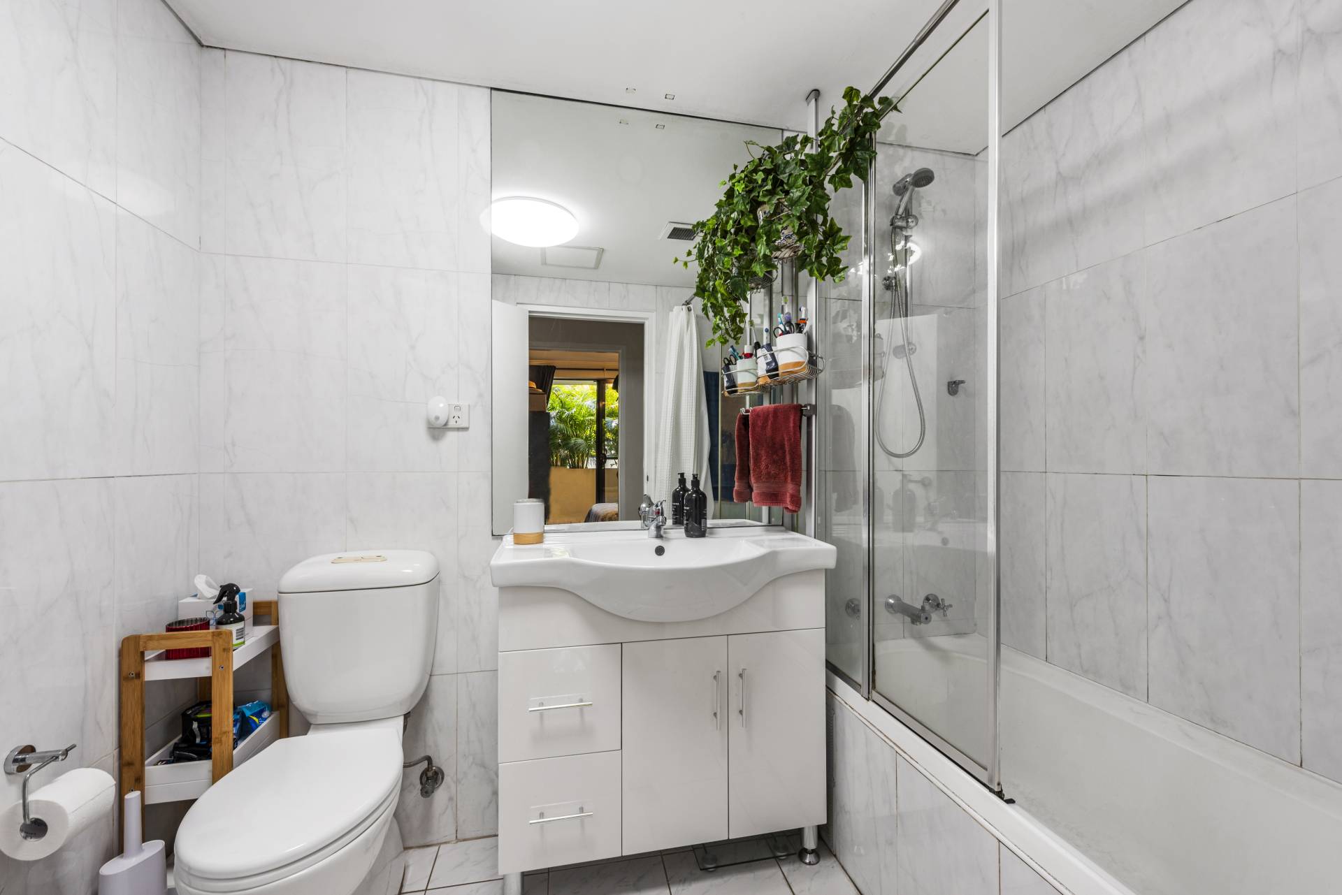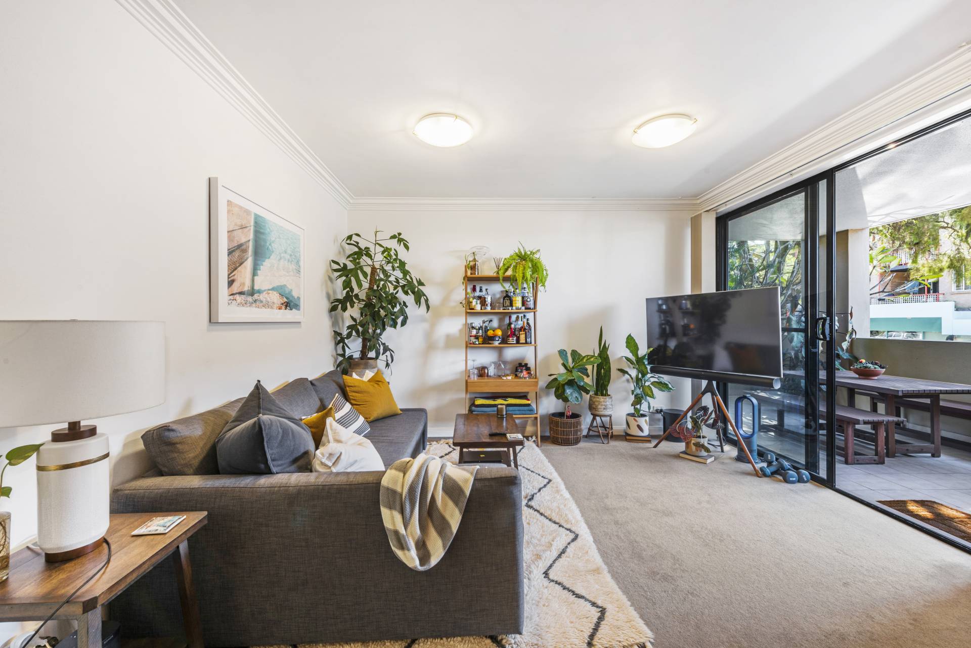 • Spacious Double Bedroom: Includes a built-in robe and opens to a private, leafy balcony through large sliding doors.