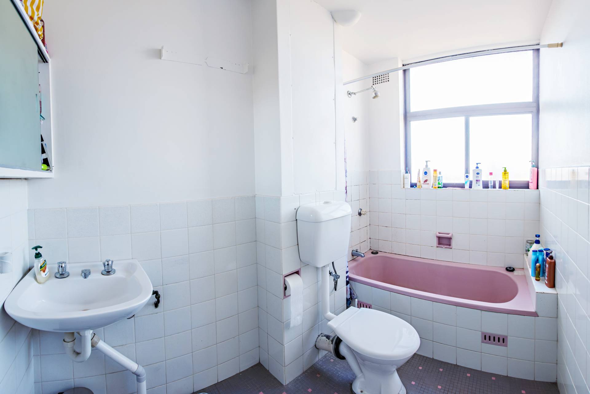 - Older style tiled bathroom with bath