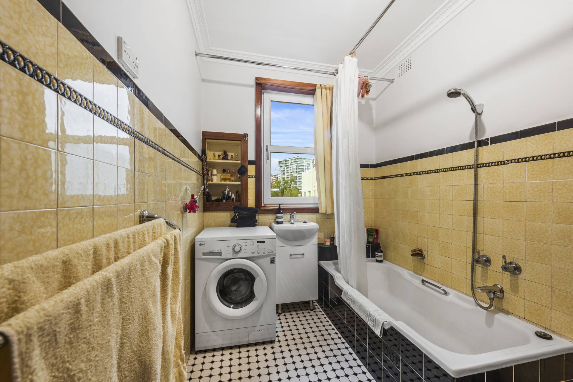• Updated period-style bathroom with original wall tiles, bathtub, and internal laundry