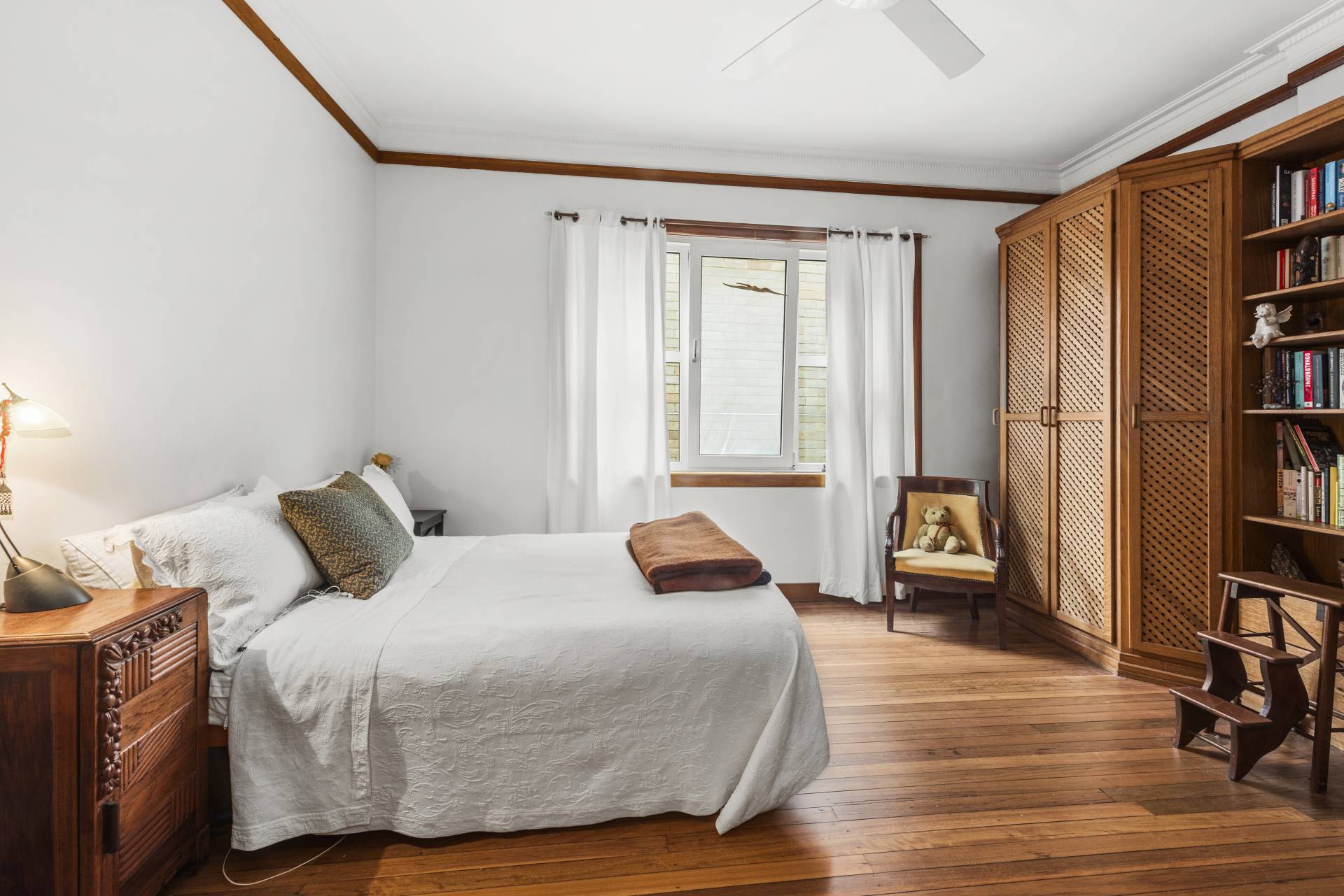 The king-sized bedroom features built-in solid Oak wardrobes and a ceiling fan, creating a restful retreat. The updated bathroom retains its original character with classic wall tiles, a bathtub, and an internal laundry.