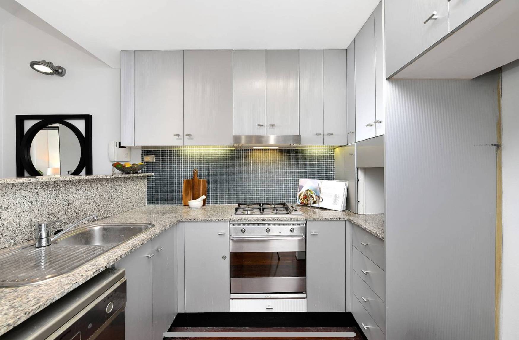 * Kitchen with gas cooking and stone benches.